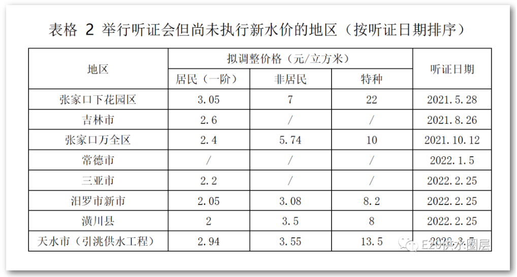 除了上述已執行新水價的地區外,據不完全統計,有6個地區在10月1日之后舉行了聽證會,預計近期將執行新水價。另有張家口下花園區和吉林市聽證時間早于10月1日,但至今仍未執行新價格。具體價格信息可見表2。